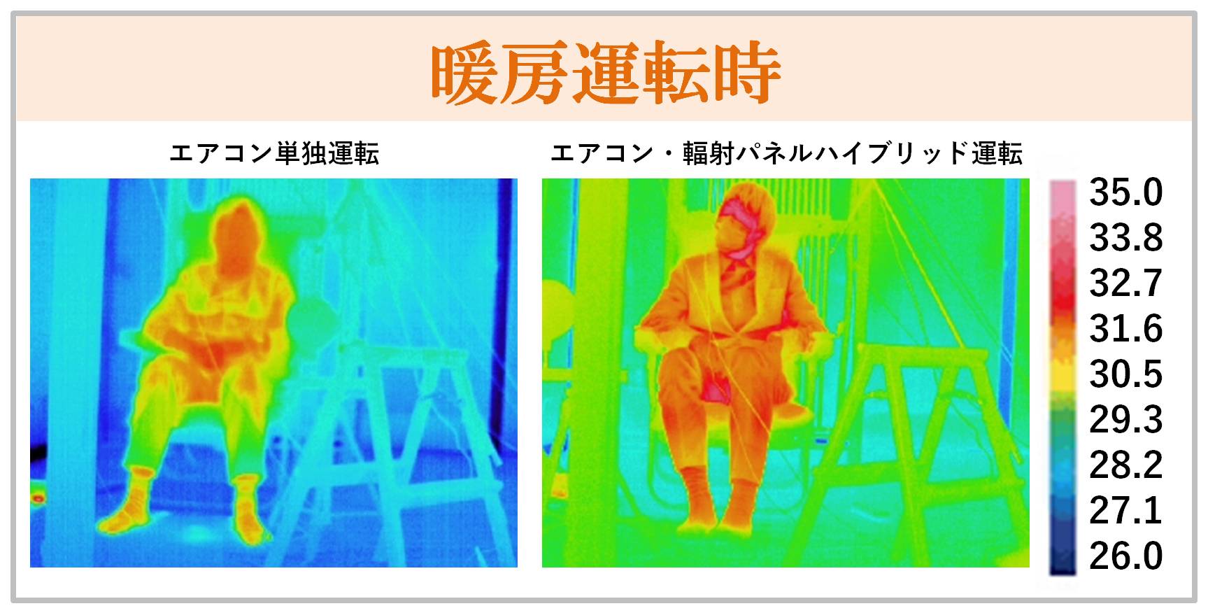 エアコン単独運転の場合、床・壁・物が充分に温まっておらず、人体の体表面の温度が低い。これに対してエアコン・輻射パネルのハイブリッド運転の場合は、床・壁・物がほぼ均等に温められており、人体の体表面の温度も高いため、ぽかぽかと温かい体感を得られていることが分かる。